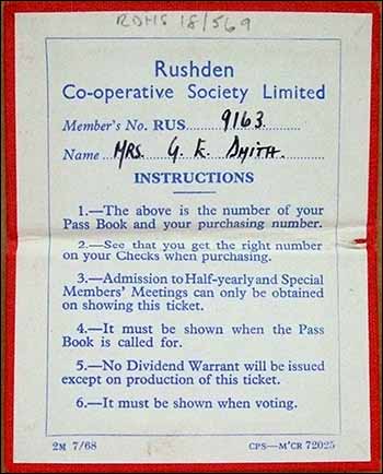 On joining the Co-op a unique number was given to each member. The number was quoted when a purchase was made, and at the end of each half year the total spent entitled the member to a percentage return and this could be paid out on 'Divi Day' or left to accrue in a membership account. This card is from the late 1960s, and was also used to cast a vote at Members' meetings.