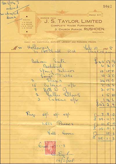 The invoice for the furniture from J S Taylor of 3 Church Parade. They had ordered it on 8th November 1947, securing the price.