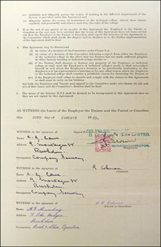 The agreement could be dissolved on certain conditions. If the employer or the technical college reported that the trainee had not made sufficient progress in his factory training or his college work, then the agreement could be ended. If the trainee damaged or destroyed any property of the employer or college, or if he stole from them, or was guilty of misconduct or persistent inattention, he could be dismissed. The agreement also came to an end if the employer did not observe his obligations, or if he went out of business. The agreement ended with the signatures of the three parties. |