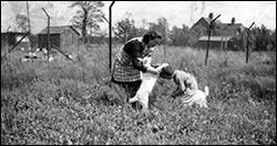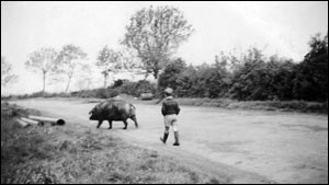 Peggy and one of her sons with a lamb at the small holding where she lived after her marriage to Mr Strickland. Later they moved further up the Newton Road to Manor Farm.