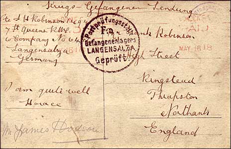 In 1901 Frank Horace Robinson, aged 6, was living at 5 Denford Road, Ringstead. He enlisted in 1916, joined the 28th Battalion Royal Fusiliers 11402, and in France he was wounded. Sometime later he served with the 7th Battalion The Queen's 14941 and was captured and transferred to a Prisoner of War camp in Langensalza, Germany.