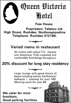 At the end of the 19th Century Rushden had many licensed public houses and lodging houses but no commercial hotel. With the expansion in trade and industry, and access by railway it was considered that an hotel was required. The Northampton brewers Phipps and Company decided this was a project they could take on. There was violent opposition from the Temperance Movement within the town, especially the voice of Mr. George Denton. They had a very strong following in the town at the time. However they lost the argument and Phipps obtained a licence and land next door to the Railway Station for the erection of an hotel. Plans were drawn up by Mr. F. Dorman of Northampton. The ground floor contained two bars, commercial room, coffee room, billiards room, kitchen and offices. Upstairs; 25 bedrooms, large drawing room and dining room. It was fitted with all modern electrical appliances and telephonic facilities by a Mr. Smith of Northampton. The contract to build the hotel was given to Mr. George Henson of Wellingborough at a cost of £12,000, this figure did not include the outbuildings and stables. The formal opening took place in April 1899. Later in the week Phipps invited distinguished guests to a grand dinner at the hotel and most responded to partake of the wonderful meal provided by Messrs. Osborne and Co of Northampton". (I am not sure if the kitchens, chef etc of the hotel were functioning at this time.) Mr. Pickering Phipps himself hosted the dinner. The list of worthies attending is extensive, I am giving just a few that I have heard of. Mr. J. T. Parker (solicitor) Mr. Paul Cave, Dr. C. R. Owen, Dr. J. Crew, Mr. J. M. Sharman. Mr. A. C. G. Vann, Dr. Baker, O. Claridge, R. Marriott, G. H. Skinner, W. Spong, F. Brazier, George Fensome, H. H. Bletsoe. In all the list amounted to 85 names from all parts of the County. The toast was to "The Queen and Prince and Princess of Wales" proposed by Mr. Phipps. Speeches then followed from Paul Cave and J. W. Ashdowne, who both mentioned the rise and progress of the town of Rushden. "Success to the Queen Victoria Hotel". The rest of the evening was spent in 'harmony'.