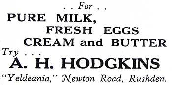 W Hodgkins began the business at Yeldeania Farm, Newton Road, which then passed to Horace, and then to Ken Hodgkins. During WWII, using a hand cart for deliveries, Ken's round was from the farm to Grove Road 34-43 onwards, Denmark Road, Oswald Road, Robert's Street and Winchester Road.