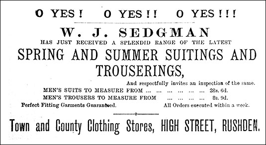 Among the recently established business enterprises of note in Rushden must be mentioned that of Mr. W. J. Sedgman, Clothier and Juvenile Outfitter, who occupies commodious and well-appointed premises at No. 3, Victoria Buildings, High Street. Mr. Sedgman is evidently thoroughly acquainted with the trade in all its branches, for he is maintaining a stock remarkable for variety, excellence, and cheapness, and consequently is attracting a considerable share of patronage. All kinds of fashionable ready-made clothing for men, youths, and boys may be found at this establishment, together with juvenile outfits, silk and felt hats, caps, hosiery, shirts, cuffs, collars, ties, scarves, gloves, umbrellas, etc., etc. The premises possess a handsome lofty frontage, and are well adapted in every way to the business in hand. Mr. Sedgman has had no reason to complain of the success that has attended his efforts during the few months he has been established, and the people of Rushden have cause for congratulation on the acquisition of such a reliable and enterprisingly conducted clothing business. [Philip Sedgman was manager in 1901, J J Clark had taken over by 1908]