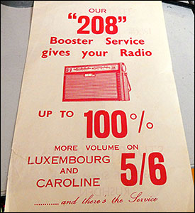 So a cheaper, but less effective method was to have a “glow effect” fire, with a bulb that was the useless source of heat was used. John decided to open up his own business, after a spell of working for a firm in Kettering. His service department was at “Refuge Terrace” in Higham Ferrers. (this location has now gone). One unusual offering, was to give your transistor radio a 208 booster service, and for the princely sum of 5/6d, they would give the likes of Radio Luxembourg and Radio Caroline a possible 100% boost in power. This was in the time that the BBC gave us little, or no Pop music. So radio shows were broadcast from the Principality of Luxembourg, and from Easter 1964, Radio Caroline was anchored off the East coast of England, broadcasting from a radio ship. |