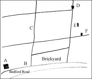A. Dickens' cottage. B. Stile over which Dickens went to his work, along footpath. C. Where Dickens was work on Wednesday morning, and where the tools were found. D. Pond near which the basket was found. E. Spot where the murder took place and from which the body was dragged to F. where it was found concealed in ditch.