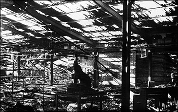 After leaving this building, the watchman clocked in at other points and when returning to this area having crossed the open trench carrying the sprinkler main, he noticed the fire glowing through the roof lights and window near the end of the production line. It is estimated that this was at approximately 22.15 hours. He attempted to call the Fire Brigade from an adjacent building but failed to contact the G.P.O. exchange.