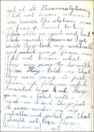 When I was going to London I went by the Rushden train and stopped at St Pancras then got out .... at St Pancras Station. I did not know where I was because the station was so funny. I went to a place where we went and had a look round. As soon as I got inside they took my umbrella and jacket away from me. I did not know what they were going to do with them. They told me that they were going to put them up for me while I wanted to go out. They gave me a ticket with a number on it and they put the same number on my umbrella and jacket so that I should not lose them. When I came out I went up the street and Lost my way. I asked a man and he did not know the way.