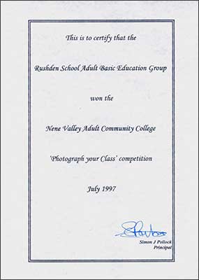 Basic English and Maths were one of the many Adult Education classes held at Nene Valley Committee College Rushden. In this category each tutor was allowed ten students and usually two volunteers. Each session lasted two hours. There were two Monday evening classes with myself (then Karon Rice) and Steve Garrett both teaching either English or Maths all at varying levels.