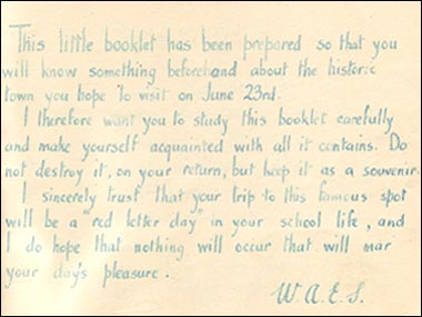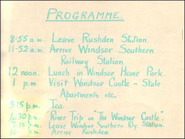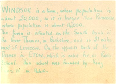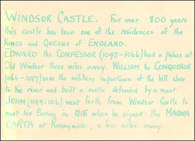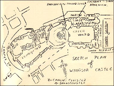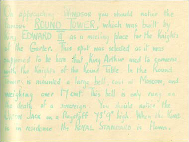 On approaching WINDSOR you should notice the famous ROUND TOWER, which as built by King EDWARD III as ameeting place for the Knights of the Garter. This spot was selected as it was supposed to be here that King Arthur used to converse with the Knights of the Rount Table. In the Round Tower is mounted a large bell, cast at Moscow, and weighing over 17 cwt. This bell is only rung on the death of a sovereign. You should notice the UNION JACK on a flagstaff 73'9'' high. When the King is in residence the ROYAL STANDARD is flown.
