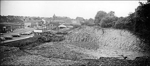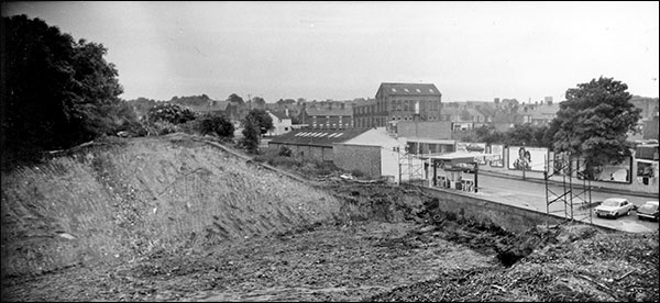 The breach in the old railway embankment to make way for the new sewer from Duck Street.