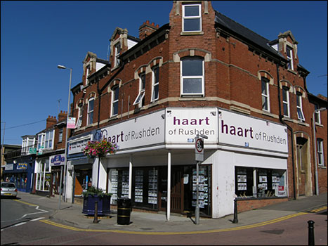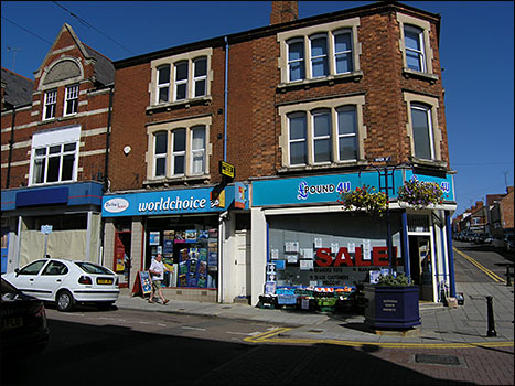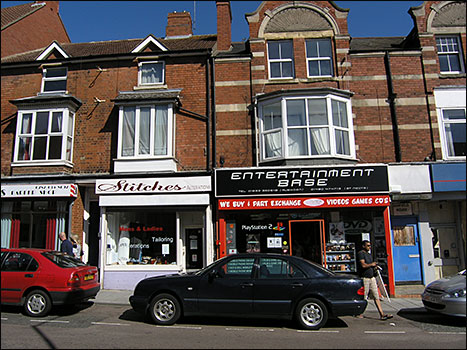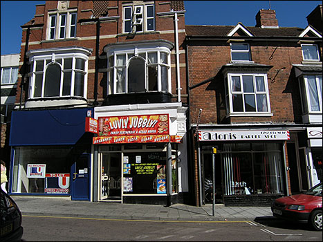 Four units all rather like houses converted into shops, red brickwork, 'white' brick decoration at roof level, a variety of Bay windows at first floor level, one partly bricked in.