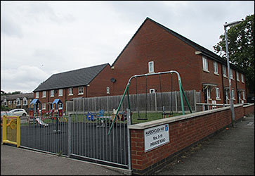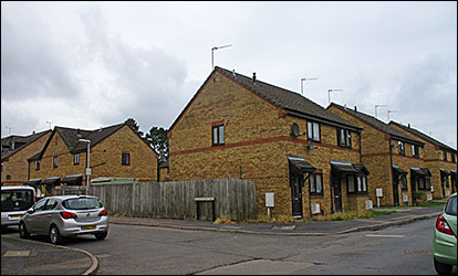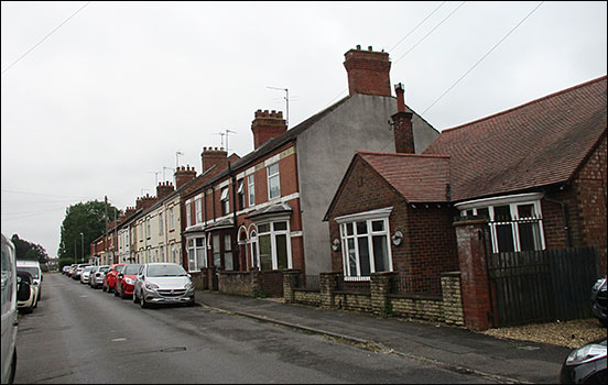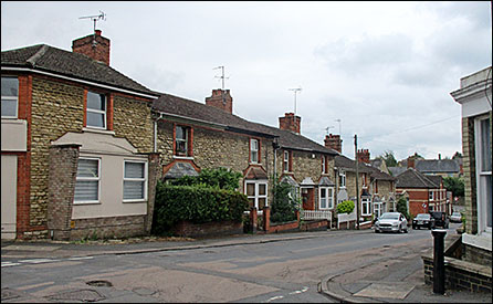 With just a few terraced houses, this street is behind the Farm House and this grass area with footpath into the Barrington Road estate, and on up towards the Bypass and Harborough Field Surgery.