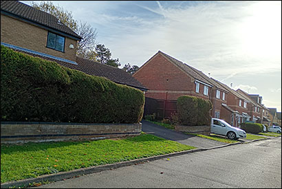 42 Harborough Way - originally the lodge for the Cemetery caretaker, has its garden fence along to 40 (above) with sign pointing into Pightles and the house
