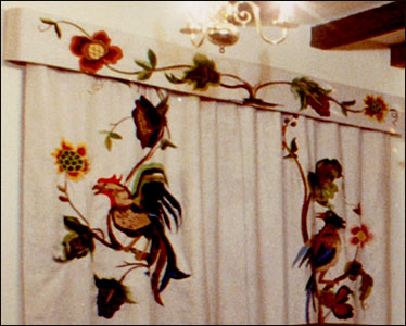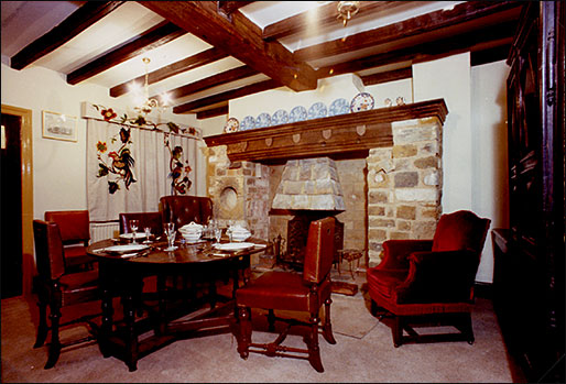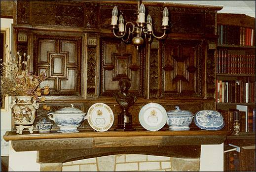 Since we have now ascended the stairs, we incorporated three long, slightly curved beams under the existing ceiling - these were acquired from old pigsties at the rear of The Nunnery, Rothwell (via Ivan Hamilton) and despite their length, were brought home on the roof rack of my A30 van; the one closest to the chimney breast was used to fix the Jacobean overmantel from Goldington Bury and incorporated simple cupboards at each end. A window seat was put in the left hand recess from Parson's Cottage, Irchester, and was the one that we had found a number of coins underneath, pushed through a crack in the top, no coins of great value but back to the 1600's. The fireplace was built by Dad from Wellingborough stone including two stone brackets from a first floor fireplace in Gold Street - quite a nice detail, the lintel of the opening incorporated a shield shaped keystone from a Washbrook Road house, demolished and rebuilt next to the Oakley pub, a wide Oak shelf was put on top but not sure from where. The overmantel with quite an attractive example of applied decoration and carved panels of strapwork of about 1600, was part of a complete panelled room from Goldington Bury sold by the Inskip family. I purchased it from Don Sherwood for £15. I could have had the complete room for £75 but couldn't afford it. The overmantel originally had four carved figures on it, I assume in the style of the carved heads which remain, but these were removed before Don acquired it and we covered the vacant spaces with four carved pieces of fruit and leaves, Victorian pieces from old furniture that Brian and I found in the garden of the 'Pink House' at Earls Barton and look quite well.
