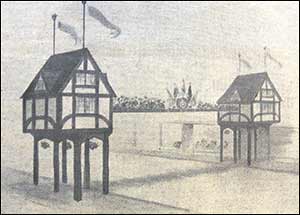 The official decorators were not among the early birds. Their Tudor arch of obvious promise was but a skeleton of builder’s tubing, and their verdant lamp-posts were still without verdure. They had no plan to fleck the sky with pennants what a pity this was! and their hint to High Street about Tudor roses and pretty shades of colour had but limited effect.