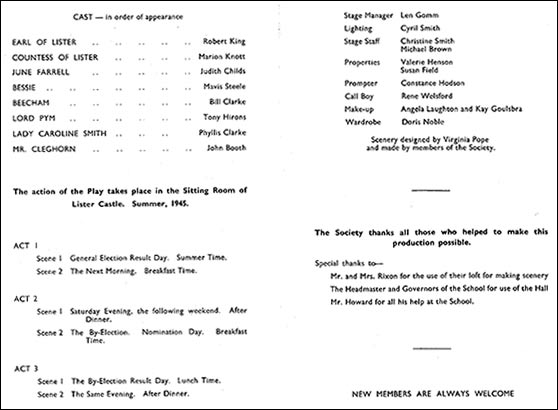 The cast is: Lord Lister, Robert King; Lady Lister, Marion Knott; June Farrell, Judith Childs; Bessie, Mavis Steele; Beecham, Bill Clarke; Lord Pym, Tony Hirons; Lady Caroline, Phyllis Clarke; Cleghorn, John Booth.