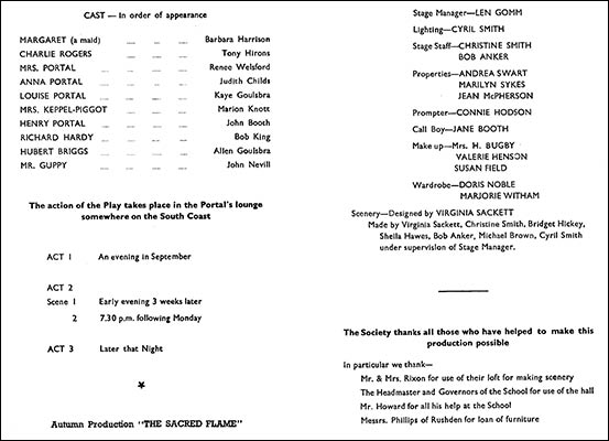 Scenery was designed by Virginia Sackett and made by Virginia with Christine Smith, Bridget Hickey, Sheila Hawes, Bob Anker, Michael Brown and Cyril Smith, under the supervision of Mr. Gomm, the stage manager.