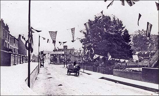 During the week the streets have presented a lively appearance and he would have been a dull individual who did not realize that something unusual was in progress. In the earlier part of week workmen were busy on all hands fixing up bunting and devices for illumination, and by Wednesday morning the whole of High-street was in holiday garb. To deal with the the decorations would be a herculean task, but those of our readers who imagine that our survey should have been extended will, we are sure, accept our assurance that any short comings in this respect on our part were through pressure on space and stress of work. Naturally enough the chief decorations were to be found in the High-street and High-street-south. The visitor to Rushden would probably start from the station, and if he did the displays would probably have struck him in the following order:-