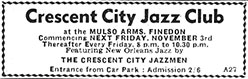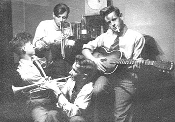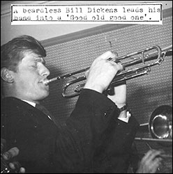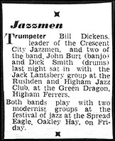 The listeners at the Compasses can be classed as true devotees. One man and his wife travel from Market Harborough to listen. This couple were some years ago friendly with the American singer Mildred Bailey and her husband Red Norvo and still maintain their interest in jazz. Another customer who must rate as the oldest jazz fan in the county is eighty-three-year-old Archie Dickens. Archie who used to play ragtime piano accompaniment for the silent films in Wellingborough is reluctant to sit in with the band but will sometimes play a couple of tunes at the end of the evening.
