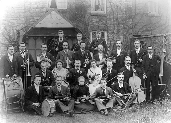 "Rushden Patriotic Orchestra 1900-1901" Photo by S Powell The lady in the front row is Miss M E Clipson, next is the Leader Shakespeare Brown