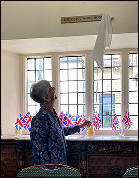 | Clive's sister Jen, unveiling the name board above the window in the panelled room in the Hall. |