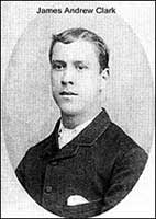 James Andrew Clark was born on 29th April 1868 at 19 Thomas Street, Poplar, Middlesex. He was the son of Robert Clark (an officer in the Merchant Service) and Ann (formerly Duggan). He married Alice Margaret Hunter on 23rd June 1839 at Bath Street Chapel, Poplar and died age 47 on 26th September 1914 in the London Hospital. His probate record shows that he was of School House, Arbury Road, Bow and granted to his widow and his effects were valued at £285-18s-7d. On his death certificate his occupation was shown as a school keeper. James was a cornet player, and he came to Rushden in 1907 to play in Bernard Tomkins' 'First Annual Concert' at the Public Hall. |