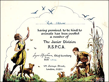 Ruth was a caring girl, and enrolled in the junior section of the RSPCA. As a member she had taken 'Mick' to an RSPCA event, and for 'handling him in the potato race' Ruth was awarded a Highly Commended certificate. [her pet dog?]