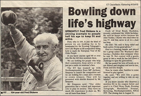 I’ve never been a competitive bowler because that kills the game. But the people I’ve met and known I never should have known if I hadn’t played bowls. Because all them years we’ve been going to Kettering, Northampton, Raunds and everywhere playing bowls. We used to go to Peterborough once a year many years ago. That got quite an outing that did and I know we used to have a bus them days to take us and coming home of course. Quite a few of them wanted to stop there and have a pint here and a pint there, it used to be quite a laugh. One of the old boys who used to play with me, he used to love his beer. By the time he got home he could just about manage to get his woods home. The Saturday night he went home he couldn’t get to the toilet quick enough, he run in the garden, dropped his woods and hit the toilet and he never thought no more about his woods. He goes off to bed, Sunday passes by and then Monday, when he’s going to start playing bowls again. He’d has his tea and he said to his wife. “Are you seen my woods anywhere?” She said. “They’re where you left them when you come home Saturday night.” He said. “Where’s that?” She said. “Right down the bottom of the yard,” she said. “You’ll find them.” I only play with the family now, we have odd game now and again. I played regular until I was 94 year old when my two mates dropped me outside here and I says. “That’s enough, another year over I don’t know whether there’ll be another year.” They said. “Don’t talk so damn silly course it will, you’ve got quite a few more years yet.” And well I haven’t played regular since, but I’ve been playing ever since anyway. And both of them men have gone what dropped me off there.