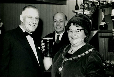 Mrs. D. E. Shrive, Chairman of Rushden Urban District Council, drawing the first pint after she had opened the modernisations at Rushden Windmill Club. With her are Mr Harry Howarth, MP for Wellingborough, and Mr. W. Furness, club president.