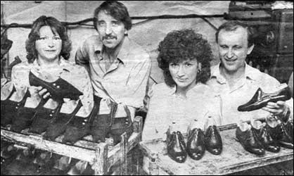 So far sales have been restricted to local wholesalers and markets but contact has been made with a Nottingham shop with which they soon hope to do business. Because production is small, it gives the firm great flexibility and keeps overheads to a minimum. "We had a target of 300 pairs a week but that went out of the window and it's now about 250 pairs. We look on 140 to 200 pair orders as big.