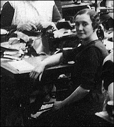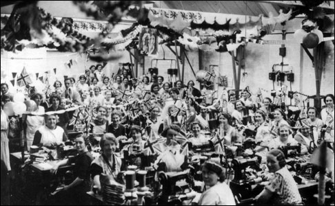 Louie worked at Park Place for all of her working life, more than 50 years, and was often chosen for making the samples. The picture shows Louie in a dark dress (front left corner) in the closing room which was well decorated for the celebrations in 1937 for the King’s Coronation.