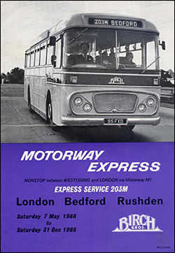 In October 1959 part of the main 203 service was rerouted via the newly opened M1 making for a much faster journey. Double deckers were not allowed on the motorway so single deckers numbered 203M were brought into service. Gradually the original 203 service was reduced. On 14th September 1969 the 203 & 203M bus routes were sold to United Counties together with twelve vehicles and the depot in Rushden was also sold. The Birch name lived on with their coach business running from the depot in Kentish Town. On 1st February 1971 the business and coaches were sold to the George Ewer Group and so Birch's faded from the public transport scene forever. |