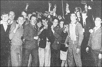 The crowd from the platform climbed into the compartments with waving, cheering and singing, photographed as they did so by several local amateur photographers popping off dozens of flash bulbs.