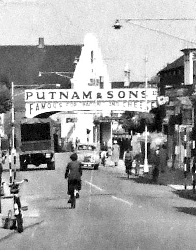 Clipped from carnival photos, the old bridge in its heyday Putnam & Sons Ltd advertised Bacon and Cheese above the road.