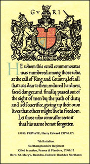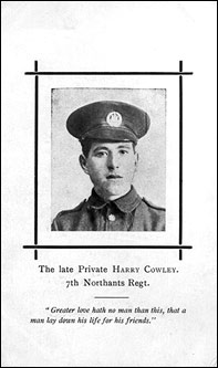 Mrs Cowley, of Church street, Rushden, has received official confirmation of the death of her son, Pte Harry Cowley, 7th Northants, already unofficially reported in the "Rushden Echo". The message from the War Office is accompanied by the usual message from Lord Kitchener, expressing the deep sympathy of the King and Queen.
