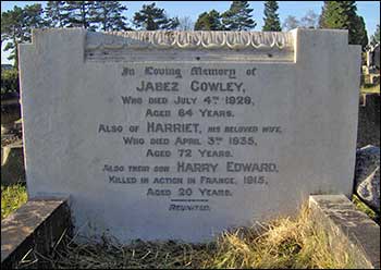 In loving memory of Jabez COWLEY who died July 4th 1928 aged 64 years. Also of Harriett his beloved wife who died April 3rd 1935 aged 72 years. Also their son Harry Edward killed in action in France 1915 aged 20 years. Reunited.
