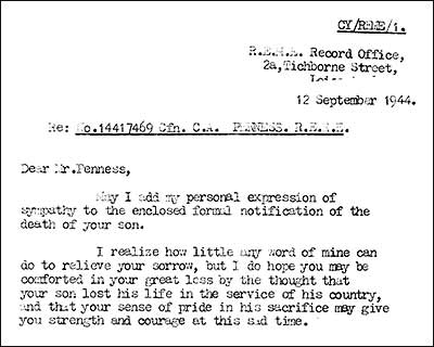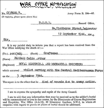 Mr & Mrs James Penness of 71 Newton Road, Rushden, heard on Wednesday that their youngest son, Craftsman Colin Roderick Penness R.E.M.E, attached to a Tank Regiment in the Central Mediterranean, has died of wounds due to enemy action.