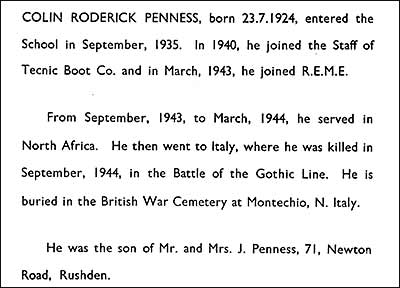 Colin Penness (WGS 1935-40), from Rushden, joined the Royal Electrical and Mechanical Engineers (REME) in March 1943. From September 1943 to March 1944 he served in North Africa and then took part in the allied invasion of Italy, where he was killed, aged 20, on 3rd September 1944 in the battle of the Gothic Line. He was buried in the British war cemetery at Montecchio in Northern Italy.