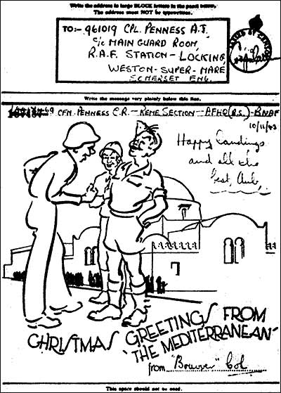 Right is a Xmas Greeting card sent to his brother Aubrey J Penness, in 1943, signed "Bruvver Col".