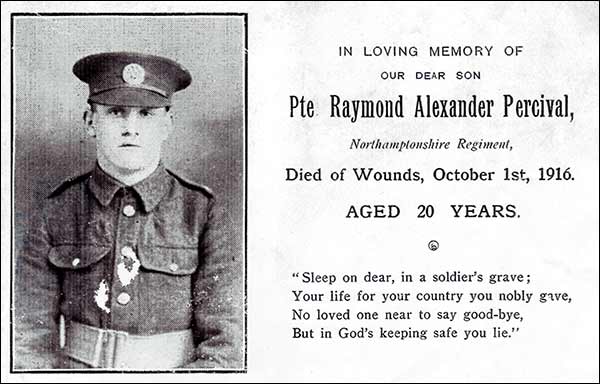 Pte Raymond Percival, Northamptonshire Regiment, of Irchester, died at Southampton from wounds received three weeks previously in France. Deceased was twenty years of age, and enlisted six month ago.