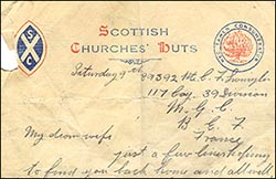 just a few lines to let you know I am quite well and I hope this will find you all the same at home. I am getting a bit used to it now but I don't believe I shall learn to like it very quick, of course I am got used to my mates now so it doesn't seem so bad, I hope you will have good luck and all keep well at home then I shant mind so much, I had a letter from Bill this morning he posted it on the 11th so it took it a good while to come, it seems a treat to get a letter from home, I have not wrote your people yet but I will sometime but out here you want to get to sleep every little chance you get as you never know when you will get the next one, I am getting a decent going on regards food here in the trenches the corporal in charge is a good chap to look after and cook the food for us we have got rabbit for dinner today that is alright you know for trench food, I think I would sooner be in the M.G.C. than the infantry according to what I can see but of course whatever you are in you want good luck, and I hope I have good luck, I should think men that have been out long are fed up with it, the time seems to go slow when you are in the trenches especially when Johny is shelling like hell, its one continual rattle of guns I don't wonder at it weakening anybody's nerves, the chaps that I am with have been out here a long while and of course we are pretty lively, though I think of home a lot All the time. I don't feel miserable you know I shall be alright if I have good news from home and I hope you will do as well as you can to be bright and we must wait patiently till the time comes when I come home again, let me know if you made anything out of the capital letters in the last letter, look for the dots under them, I have got a green envelope this time and I don't think these are read through, I don't think I have any more to say so I close with love to all from your loving husband Frank xxxxxxxxxxxxxxx